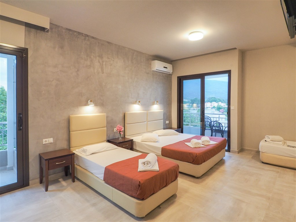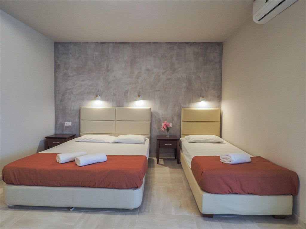klimatizované třílůžkové nebo čtyřlůžkové pokoje,