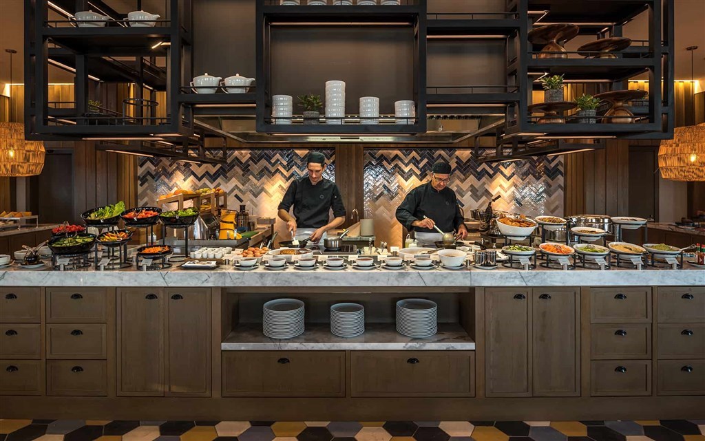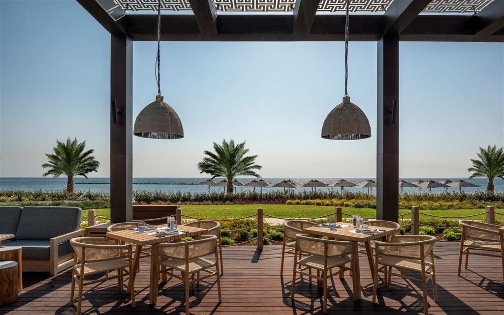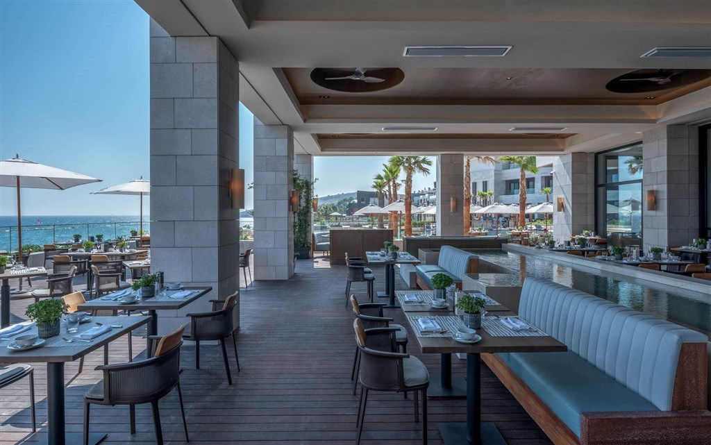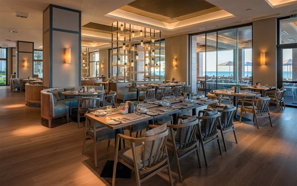 pět úžasných restaurací - Amara´s breakfast s výhledem na pláž nabízí kromě bohatých snídaní stravování i během dne, à la carte restaurace je specializovaná na speciality kyperské kuchyně, špičkovou gastronomii představují michelinské restaurace Nobu Matsuhisa a Giorgio Locatelli, každá restaurace má díky osvětlení, hudbě a barvám jedinečnou atmosféru,