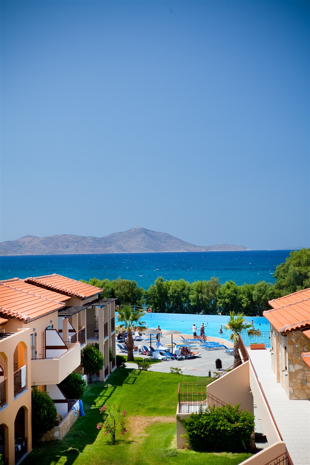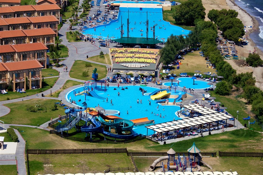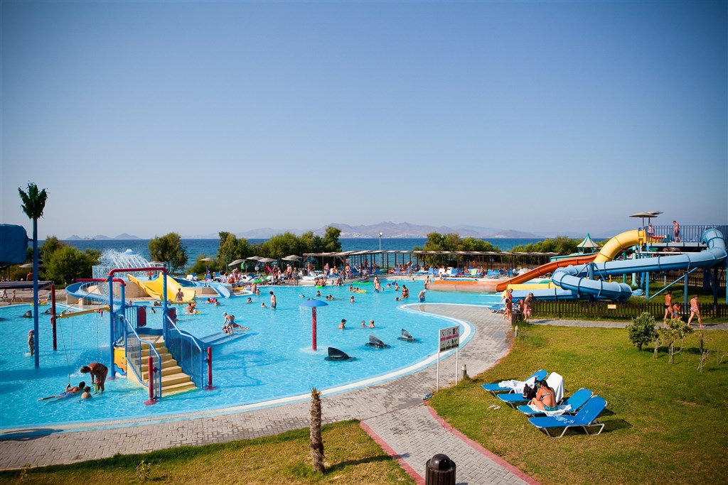 Oblíbený Aquis Marine Resort je tvořený hlavní budovou a dvoupodlažními domy umístěnými v zahradě. Nachází se v severní části ostrova, necelé čtyři kilometry od známého letoviska Tigaki a 6 kilometrů od hlavního města, se kterým má autobusové spojení. Díky aquaparku s vodními atrakcemi je vyhledávaný především rodinami s dětmi. Písčito - oblázková pláž je poměrně úzká, místy s kamenitým vstupem do vody. V dosahu deseti minut chůze se nachází dlouhá písečná pláž s pozvolným vstupem do vody.