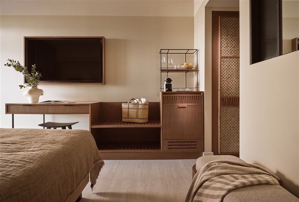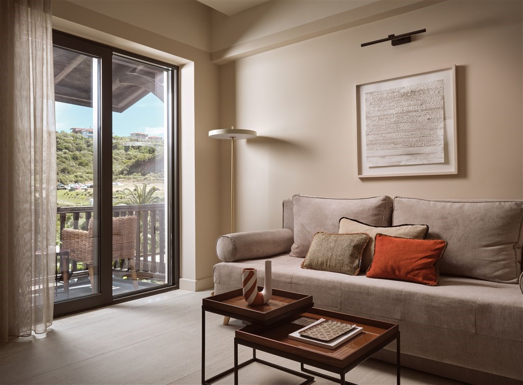 Interiér 40 m², elegantní klimatizované suity umístěné v hlavní budově, ložnice je od obývací části oddělena posuvnými dveřmi, koupelna s WC, LCD/SAT TV, rádio, telefon, mini Hi-Fi systém, wifi, trezor, minibar, Espresso kávovar, koupací pláště a pantofle, plážové osušky, balkón nebo terasa. Max. obsazenost 3 dospělé osoby a 1 dítě.Junior suita výhled na moře (hlavní budova)
