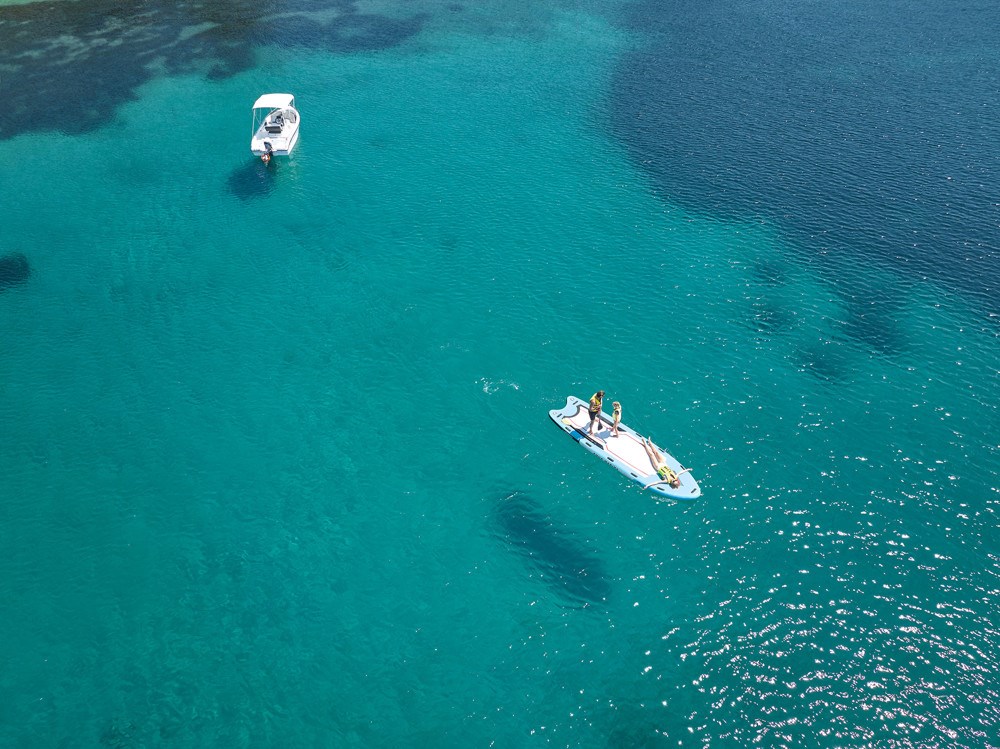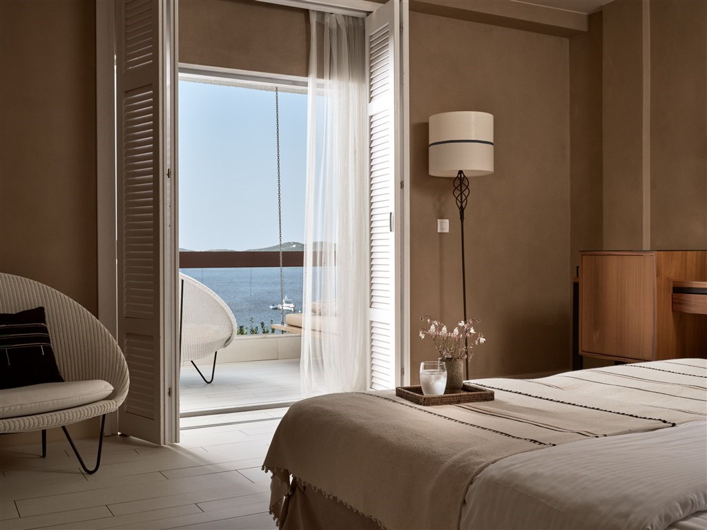 Interiér 80 m², elegantní klimatizované suity umístěné v hlavní budově, ložnice s dvoulůžkem a oddělený obývací pokoj, koupelna s WC a druhý WC, dvě LCD/SAT/TV, rádio, telefon, mini Hi-Fi systém, wifi, minibar, trezor, Espresso kávovar, koupací pláště a pantofle, plážové osušky, terasa s privátním bazénem. Max. obsazenost 3 dospělé osoby a 1 dítě.Dvouložnicová suita výhled na moře (hlavní budova)