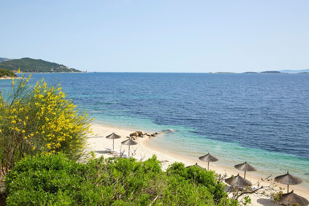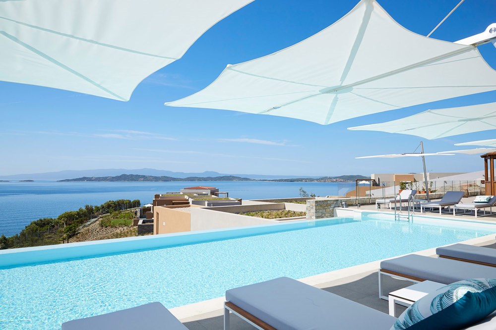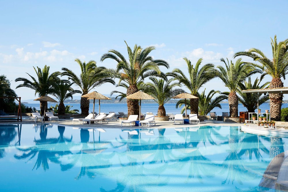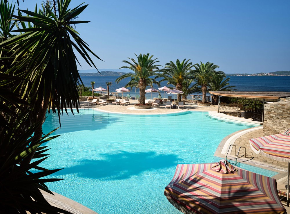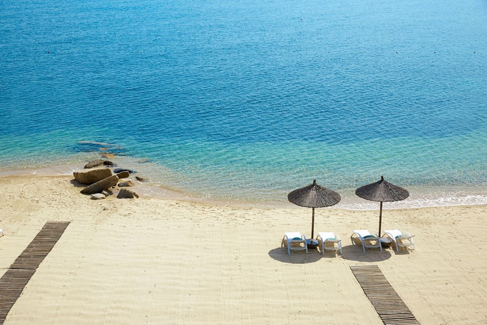Interiér 50 m², klimatizované elegantní bungalovy umístěné v zahradě, ložnice s dvoulůžkem a obývací částí, koupelna s WC, TV, rádio, telefon, wifi, minibar, trezor, Espresso kávovar, koupací pláště a pantofle, plážové osušky, vybavená terasa s privátním bazénem. Max. obsazenost 2 dospělé osoby a 1 dítě.Grand suita u moře s privátním bazénem výhled na moře (hlavní budova)