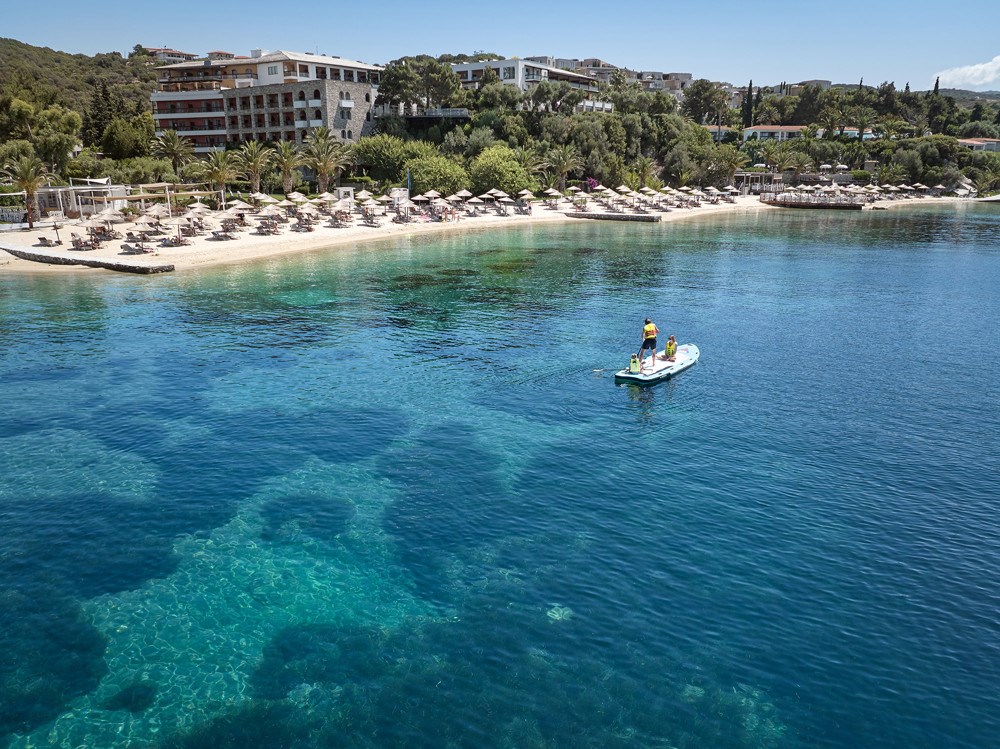 Interiér 50 m², klimatizované elegantní bungalovy umístěné v zahradě přímo u moře, ložnice s dvoulůžkem a obývací částí, koupelna s WC, TV, rádio, telefon, mini Hi-Fi systém, wifi, minibar, trezor, Espresso kávovar, koupací pláště a pantofle, plážové osušky, vybavená terasa s výhledem na moře. Max. obsazenost 2 dospělé osoby a 1 dítě.Bungalov výhled na moře privátní bazén