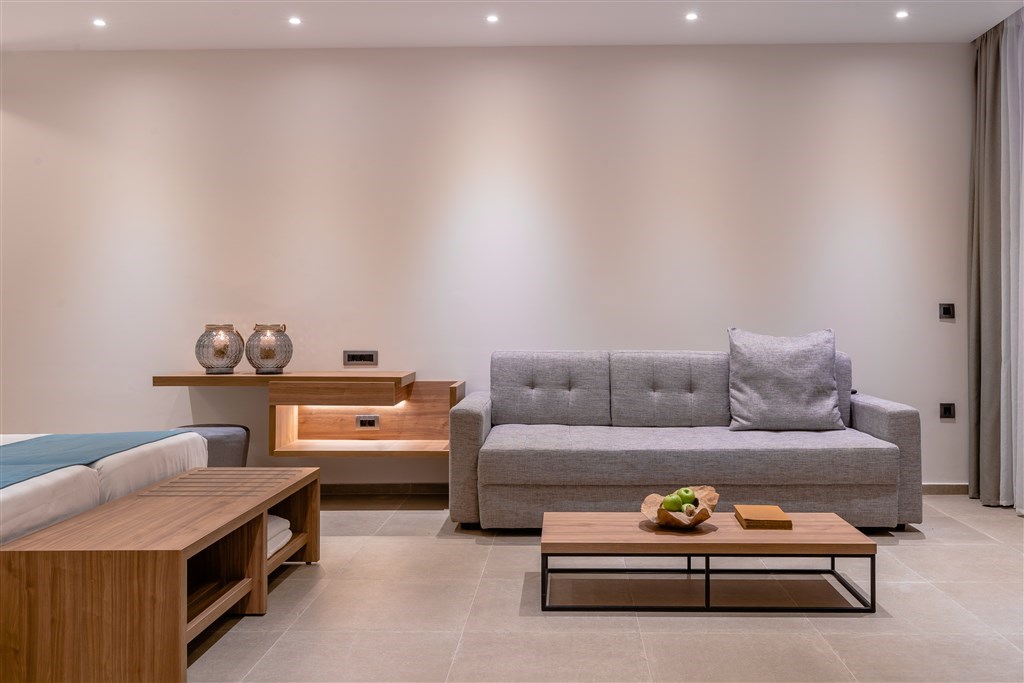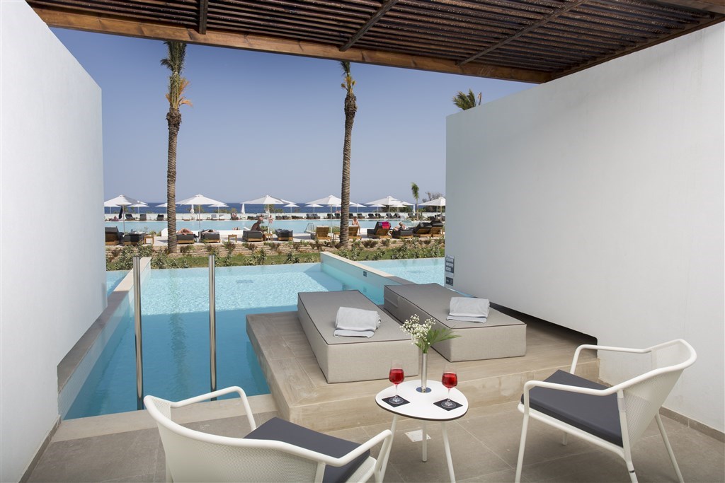 Interiér 47 m², individuálně klimatizované moderně zařízené suity s oddělenou ložnicí a rozkládací pohovkou nebo dvěma samostatnými pohovkami v obývacím pokoji, open plan koupelna se sprchovým koutem a odděleným WC, vysoušeč vlasů, koupací pláště a pantofle, SAT TV, rádio, telefon, trezor, lednička, Nespresso kávovar, vybavení pro přípravu čaje, balkón nebo terasa. Max. obsazenost 3 dospělé osoby a 1 dítě. Suita s privátním bazénem výhled zahrada / výhled na moře
