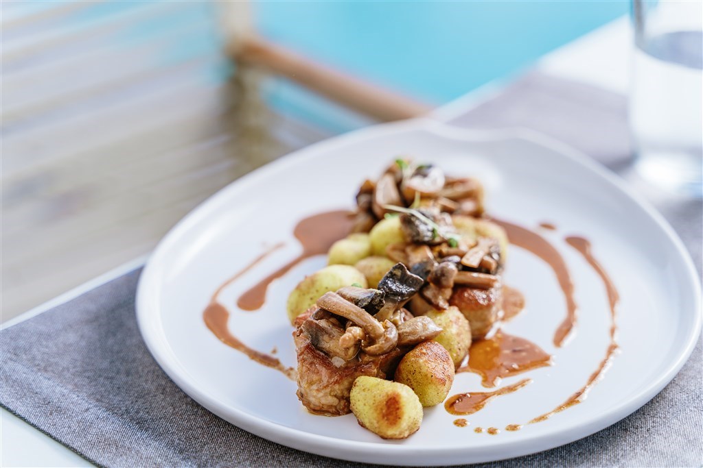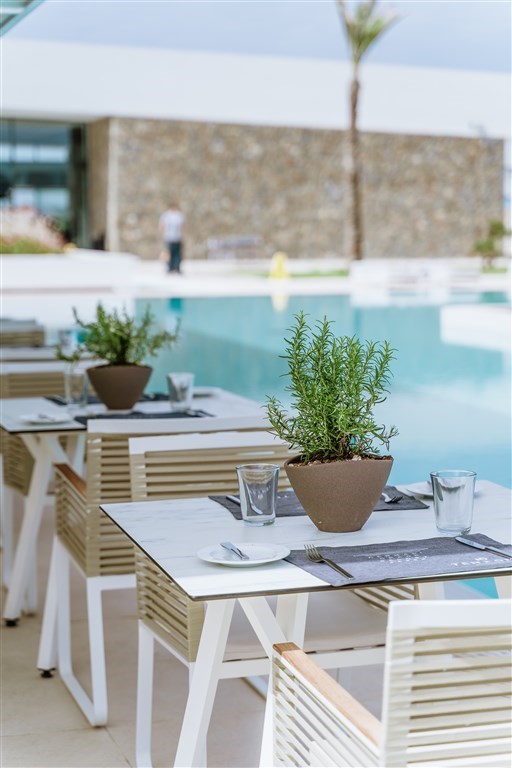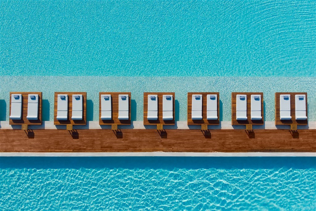 Interiér 30 m², individuálně klimatizované, moderně zařízené pokoje, open plan koupelna se sprchovým koutem a odděleným WC, vysoušeč vlasů, koupací pláště a pantofle, SAT TV, rádio, telefon, trezor, lednička, Nespresso kávovar, vybavení pro přípravu čaje, balkón nebo terasa. Max. obsazenost 2 dospělé osoby.Dvoulůžkový pokoj s privátním bazénem, výhled do zahrady / výhled na moře
