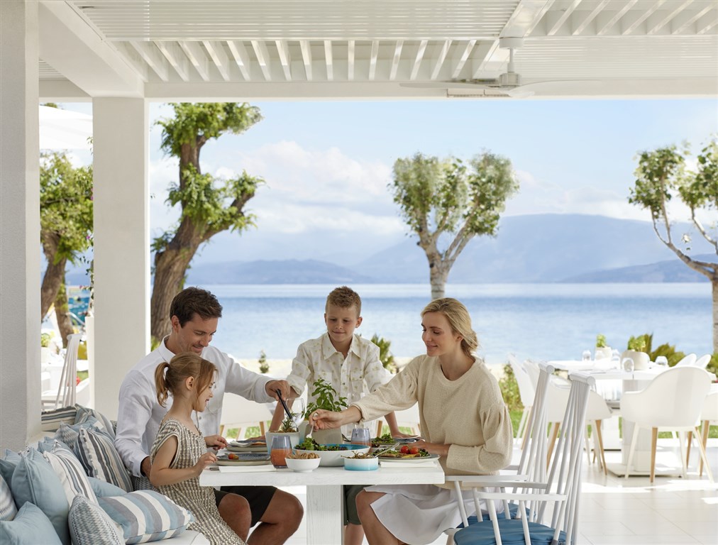 jedna hlavní restaurace, sedm à la carte restaurací jako řecká, italská, asijská, provensálská, francouzská, korfská, jen pro dospělé a barbecue,