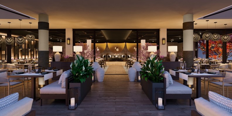 hlavní restaurace formou bufetu, pět à la carte restaurací - italská, asijská, španělská, středomořská a The Market - nový koncept resortu Ikos,