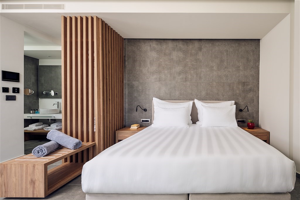 Interiér 45 m², klimatizované junior suity s dvoulůžkem 160 x 200 cm a obývací částí s pohovkou 90 x 200 cm, koupelna se sprchovým koutem a WC, balkón nebo terasa s výhledem na moře. Max. obsazenost 3 dospělé osoby.