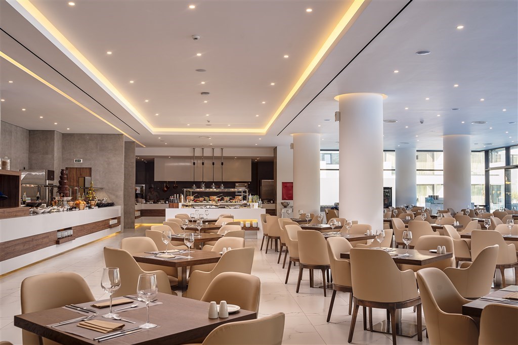 hlavní restaurace Terra Mare, à la carte restaurace s nabídkou středozemní kuchyně Acqua e Sale, řecká restaurace Thalatta Fine Dinning u bazénu a japonská restaurace Yume Mou,