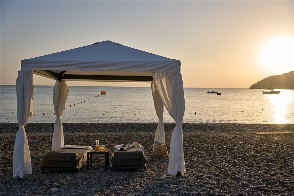 slunečníky a lehátka u bazénu i na pláži zdarma, na pláži možnost pronájmu altánku s plážovým servisem (120€/den)
