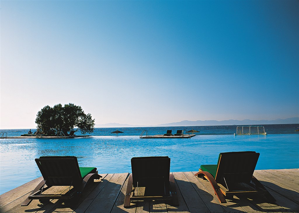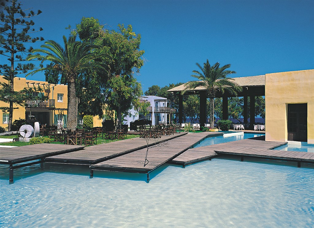 Zajímavě řešený komplex se třemi bazény, obklopenými tavernami a pool bary. U bazénů i na pláži jsou lehátka a slunečníky zdarma. V rozlehlých, pečlivě udržovaných zahradách kolem budov jsou 3 kilometry dlouhé upravené stezky na procházky. Areálem hotelu Miramare Park projíždí v hlavní sezóně každou hodinu mimo siestu Wonderland vláček, který staví u bazénů, restaurací a barů. Restaurace nabízí řecké, italské i mezinárodní speciality, exotické koktejly a malé občerstvení do pozdních večerních hodin.
